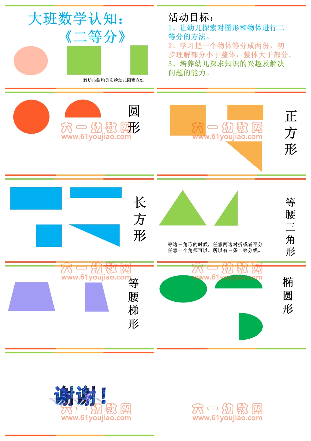 大班数学课件:二等分 大班 本站VIP用户可免费下载本课件 抱歉,此资源仅限VIP下载,请先登录 此资源仅对VIP开放下载请先登录 数学 分享到: 上一篇大班散文诗课件:小小的希望 下一篇大班社会课件:防溺水安全教育